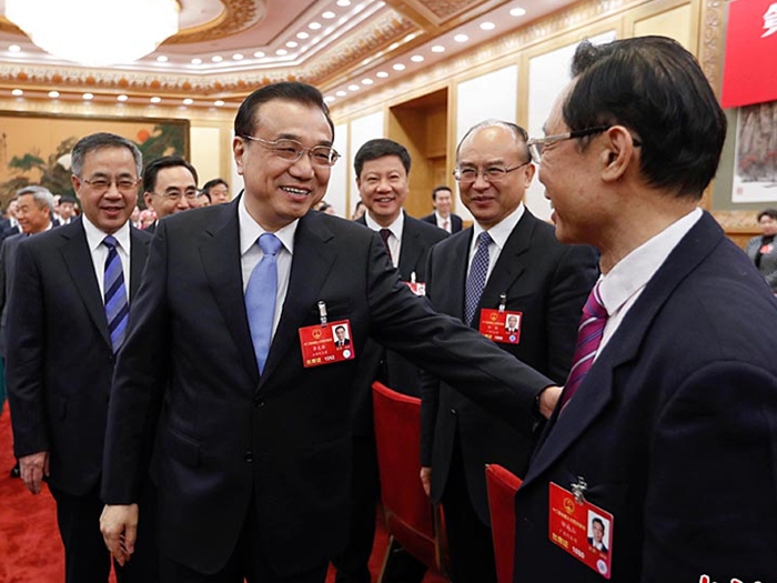3月9日,中共中央政治局常委、国务院总理李克强参加十二届全国人大四次会议广东代表团的审议。李克强同全国人大代表、中国工程院院士钟南山交流。中新社记者刘震摄