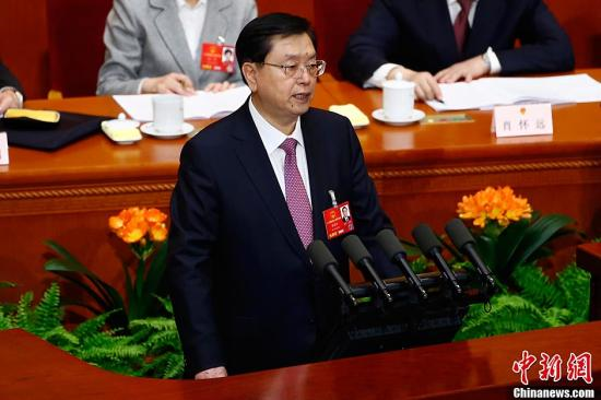 3月9日,十二届全国人大四次会议在北京人民大会堂举行第二次全体会议。全国人大常委会委员长张德江作全国人民代表大会常务委员会工作报告。中新社记者富田摄