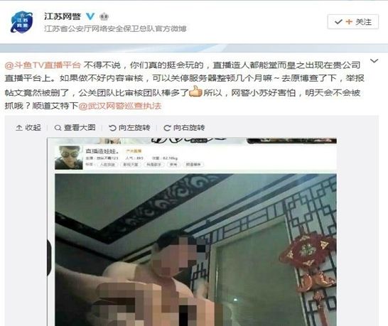 1月10日,斗鱼直播平台一位名为“放纵不羁123”的主播直播性行为,之后涉事直播间被关闭。1月18日,武汉市网信办称已经约谈“斗鱼直播”的负责人,要求其立即停播“户外直播”栏目。“斗鱼直播”的负责人表示,将吸取教训、加强管理,确保今后绝不发生类似事件。