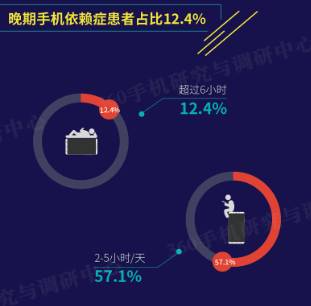 每天使用手机时长超6小时意味着什么?一天24小时除去人类必须的睡眠时间,也就是说这类人群一半清醒的时间都在使用手机,一天8小时工作时间,超6小时手机也在跟着运作。《报告》显示,有12.4%的晚期手机依赖症患者每天保持着这样的使用频率。