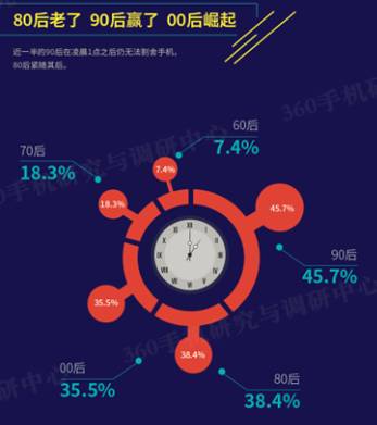 360手机报告数据表明,近一半的90后在凌晨1点之后仍无法割舍手机,80后则紧随其后,00后也不甘示弱,呈奋起态势。