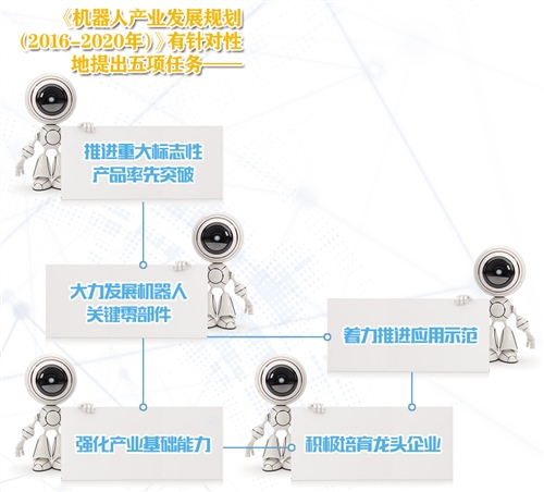 为了实现机器人产业发展的目标任务,《规划》提出了6项政策措施。其中包括加强统筹规划和资源整合;加大财税支持力度,利用中央财政科技计划、工业转型升级、中央基建投资、首台(套)重大技术装备保险补偿机制等政策措施支持机器人及其关键零部件研发、产业化和推广应用;拓宽投融资渠道,支持符合条件的机器人企业直接融资和并购;引导金融机构创新符合机器人产业链特点的产品和业务,推广机器人租赁模式等。