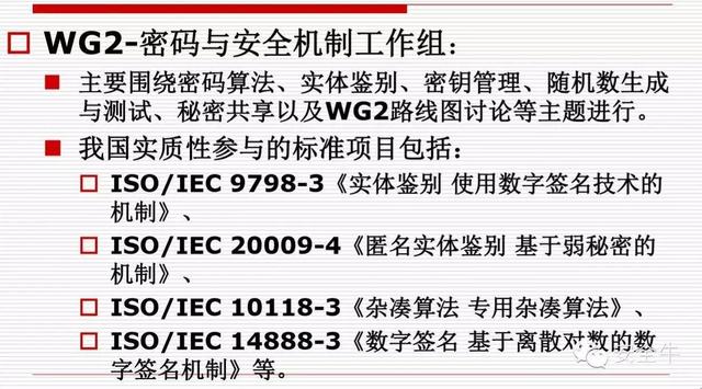 国际上信息安全标准化组织编号为ISO/IEC JTC1 SC27,下设五个工作组,分别是信息安全管理体系、密码学与安全机制、安全评价准则、安全控制与服务以及身份管理与隐私保护技术。而我国在密码方面参与的比较多。