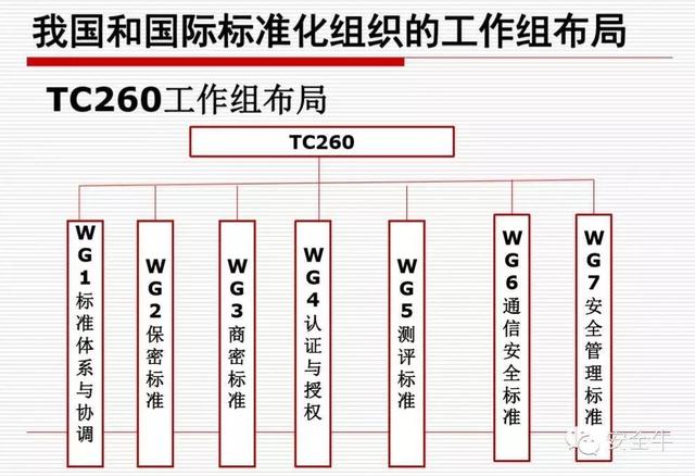 我国全国信息安全标准化技术委员(简称“信安标委”)会成立于02年4月,编号SAC/TC260,下分七个工作组,负责ISO/IEC JTC1/SC27等信息安全国际标准化组织的归口工作。