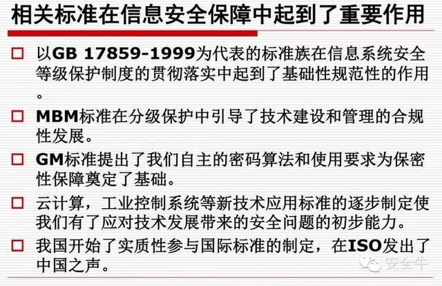 除了国家层面对信息安全保障工作的重视以外,我们也要明确“信息安全的标准化工作”也是信息安全保障工作的重要一部分。“标准化工作是维护国家主权,体现我国话语权,保安全,捍利益的重要阵地,信息安全标准体系也是我国信息安全保障体系的重要组成部分。”