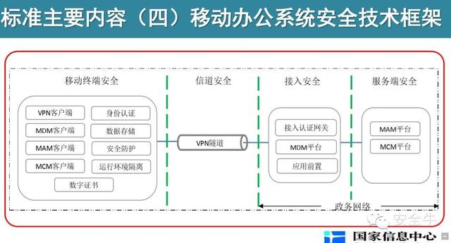 基于移动办公的5A特性(任何地点、任何时间、任何人、任何设备以及任何事务),由国家信息中心牵头的《电子政务移动办公系统安全技术规范》在15年完成标准草案,并形成标准征求意见稿。标准(征求意见稿)涉及“电子政务移动办公系统基本结构”、“电子政务移动办公系统基本安全框架”、“移动终端安全要求”、“信道安全”、“接入安全”以及“服务端安全”这几大方面。