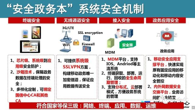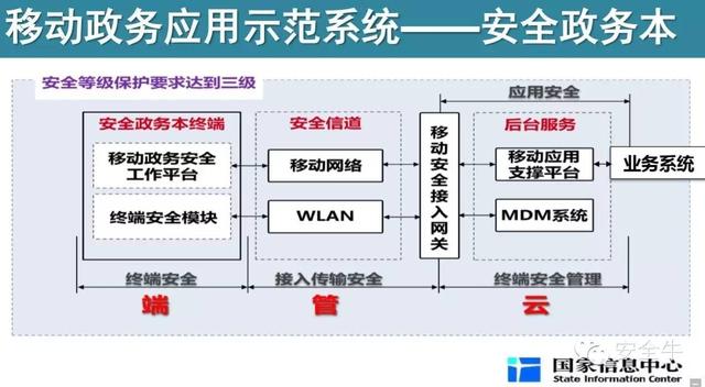 下图是移动政务应用的示范案例“安全政务本”的整体框架和安全机制。
