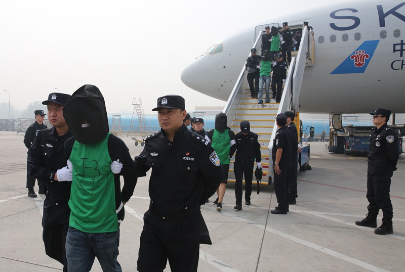4月13日,在北京首都机场,第二批67名电信诈骗犯罪嫌疑人被中国警方包机从非洲押解回国。这是我国首次从非洲大规模押回电信诈骗犯罪嫌疑人。