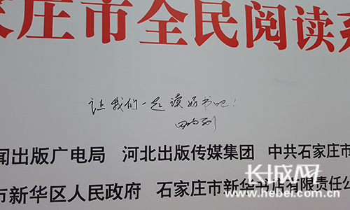 田向利在背景板上签下“让我们一起读好书吧!”。长城网宁晓雪摄