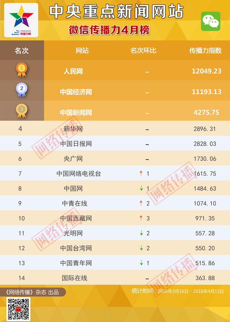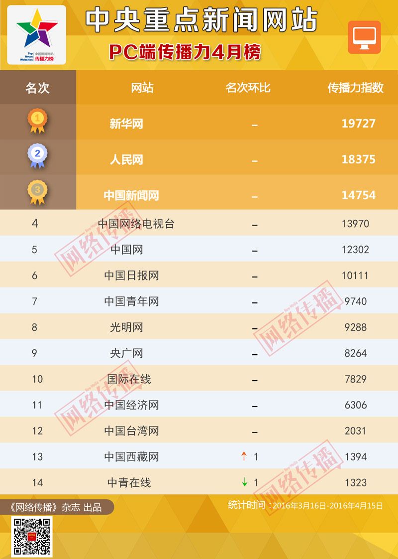 中央网信办《网络传播》杂志倾力打造的“中央重点新闻网站传播力2016年4月榜”今日发布。