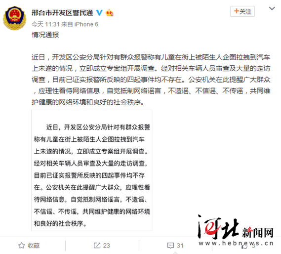 5月5日11时31分,“@邢台市开发区警民通”发布新的情况通报称:近日,开发区公安分局针对有群众报警称有儿童在街上被陌生人企图拉拽到汽车上未遂的情况,立即成立专案组开展调查。经对相关车辆人员审查及大量的走访调查,目前已证实报警所反映的四起事件均不存在。公安机关在此提醒广大群众,应理性看待网络信息,自觉抵制网络谣言,不造谣、不信谣、不传谣,共同维护健康的网络环境和良好的社会秩序。