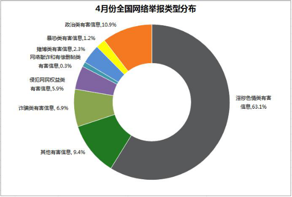 4月份,中国互联网违法和不良信息举报中心直接受理、处置网民有效举报40632件,较上月增长16.2%。经核查,会同相关执法部门处置色情、诈骗、赌博网站及链接19921条;通知百度贴吧、新浪微博、腾讯、115网盘等网站、搜索引擎服务商、在线存储工具服务商删除色情低俗有害信息98096条;通知中国日报网、果壳网、中华网等网站删除含有血腥残忍内容、贩卖毒药、教授炸药制作方法的暴恐有害信息1620条;通知新浪、腾讯、网易、百度依法处置传播虚假信息的博客账号62个、微博账号58个;通知腾讯依法处置煽动民族仇恨,从事贩卖假币、毒药、枪支等违法活动的即时通信账号923个;通知铁血网、人人网、爱卡汽车网等网站删除歪曲党史国史、鼓吹房价上涨、唱衰我经济发展前景等刻意制造恐慌、煽动不满情绪的虚假信息9875条。