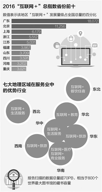 据介绍,此份“互联网+”指数报告覆盖移动互联发展基础、产业、创新创业、智慧城市四大板块,涵盖零售、金融、交通物流、医疗、教育、文化娱乐、餐饮住宿、旅游、商业服务、生活服务十大行业。与上一年度的指数相比,在同行的支持下,腾讯研究院在编制该报告时,使用了全网数据,其中包括京东的电商数据,滴滴的出行数据,美团和大众点评的生活服务及餐饮住宿数据,以及携程的旅游数据,扫描的数据总量超过70PB,相当于800个世界最大图书馆——美国国会图书馆藏书的容量。