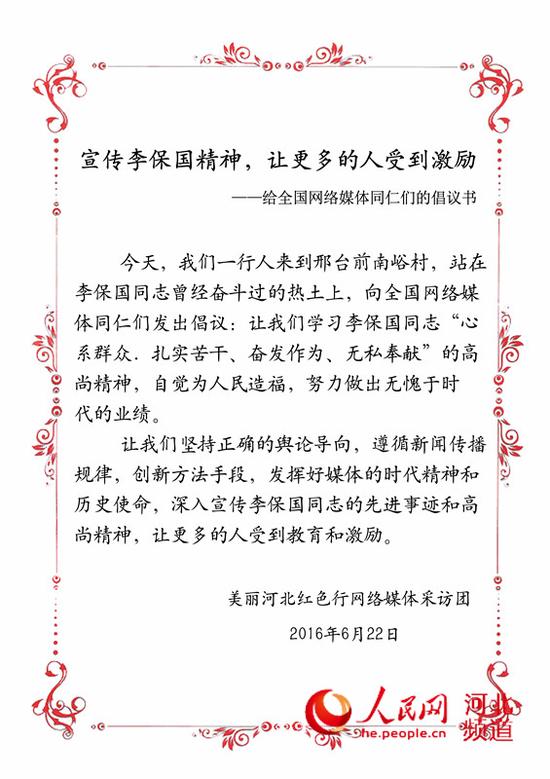 人民网邢台6月22日电(孙逸桦、王红)今天上午,由河北省互联网信息办公室和人民网主办,人民网河北频道承办,石家庄、邢台和衡水市互联网信息办公室共同协办的“美丽河北红色行——纪念建党95周年网络媒体采访活动”的一行人来到了邢台市邢台县前南峪村。在聆听当地老百姓讲述河北农业大学教授李保国曾在此地攻坚克难,染绿太行山,带领老百姓脱贫致富的事迹后,“美丽河北红色行”采访团一行人向全国网络媒体同仁们发出倡议,全文如下: