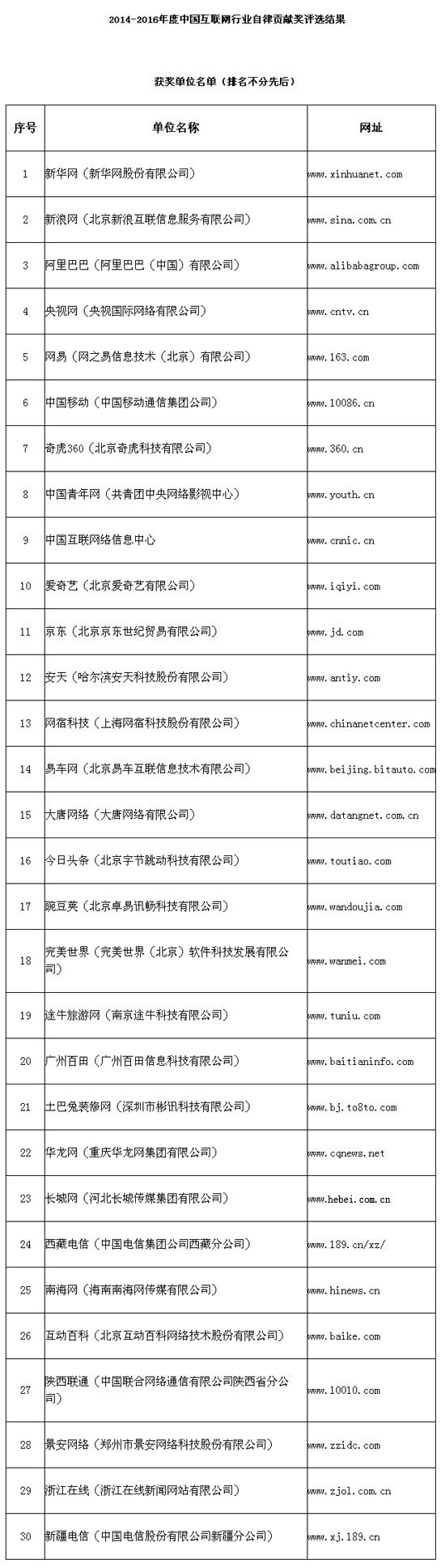据悉,2016(第十五届)中国互联网大会由工业和信息化部、国家互联网信息办公室等部门指导,中国互联网协会主办,以“繁荣网络经济,建设网络强国”为主题。“2014-2016年度中国互联网行业自律贡献奖”评选作为此次会议的主要内容之一,旨在表彰互联网从业单位在开展行业自律、推动我国互联网行业文明健康发展中所做出的努力和贡献,经过初审、终审等多个环节,最终评选出新华网、央视网、长城网等30家先进单位。