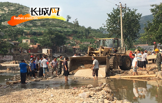 赞皇县黄北坪乡秦林村,志愿者整修滑坡路段。长城网郝烨摄