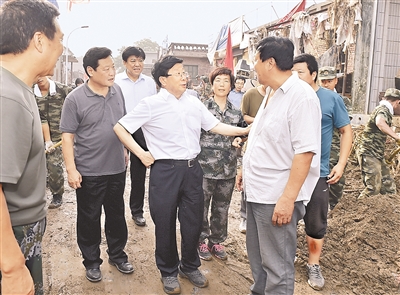 7月31日,省委书记、省人大常委会主任赵克志再次到井陉县看望受灾群众,就抗灾救灾进行调研。这是赵克志在受灾最重的台头村详细了解该村灾后恢复重建工作的开展情况。