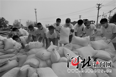 26日,35位志愿者再次出动,带着爱心物资赶赴南坪庄。村口的河水虽然退了一些,但目测仍有齐腰深。镇政府派的疏通河道的一辆大铲车帮了大家。队友们将米、面、油、菜和人都“堆”到铲斗里,先后往返几十次才把人和物资都“铲”过河去。