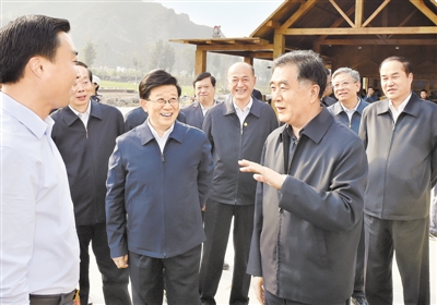 10月10日,国务院副总理、国家扶贫开发领导小组组长汪洋在省委书记、省人大常委会主任赵克志等陪同下,到保定市涞水县调研乡村旅游扶贫工作。这是汪洋在百里峡艺术小镇调研时,详细了解旅游业带动农民脱贫致富的进展情况。记者郭昭摄