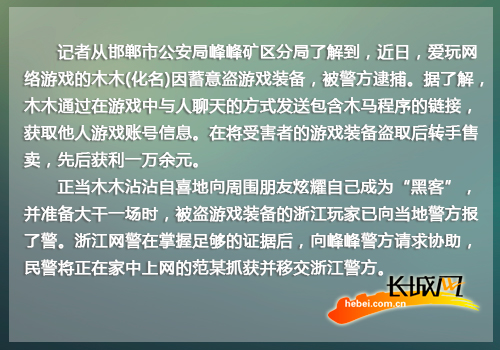 长城网10月11日讯(记者宁晓雪李全韩毅)记者从邯郸市公安局峰峰矿区分局了解到,近日,爱玩网络游戏的木木(化名)因蓄意盗游戏装备,被警方逮捕。