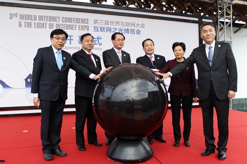 浙江省委副书记、代省长车俊,国家互联网信息办公室副主任任贤良,工信部副部长陈肇雄,浙江省委常委、宣传部部长葛慧君,浙江省副省长冯飞,科技部党组成员、科技日报社社长李平共同启动互联网之光开幕水晶球。(中国网信网焦鹏摄)