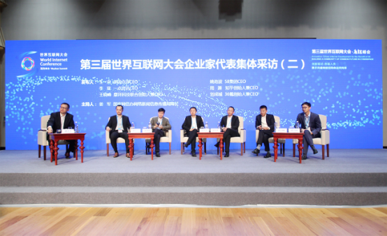 11月18日上午,第三届世界互联网大会企业家代表第二场集体采访在乌镇互联网国际会展中心网剧场举行。美团点评CEO王兴、58集团CEO姚劲波、一点资讯CEO李亚、知乎创始人兼CEO周源、摩拜科技联合创始人兼CEO王晓峰、36氪创始人兼CEO刘成城等互联网企业代表就“创新驱动造福人类”这一主题回答记者提问。集体采访由国家互联网信息办公室网络新闻信息传播局局长姜军主持。