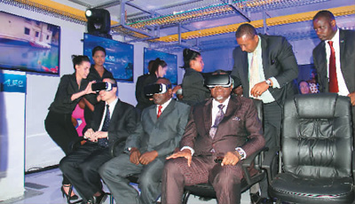 4月14日,华为在纳米比亚为非洲测试首个4.5G网络。图为纳米比亚总统根哥布(前右一)在现场体验VR设备。新华社记者吴长伟摄