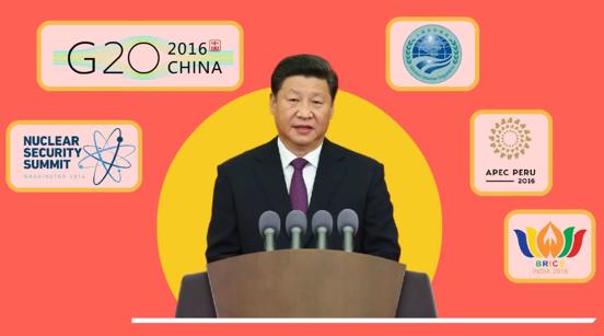 2016年,习近平出席了五场国际峰会(联合国核安全峰会、上合组织峰会、二十国集团峰会、金砖峰会、亚太经合组织峰会),为世界安全、为全球治理,阐述“中国方案”,贡献“中国智慧”。