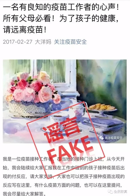 3月初,一个名为“关注疫苗安全”的微信公众号引发了广泛关注,该公号蔑称“疫苗有毒,包括狂犬疫苗在内的所有疫苗都不能打,所有疫苗都是专家们炒作出来骗人的,目的就是为了挣钱”,呼吁家长“为了孩子的健康,请远离疫苗”。