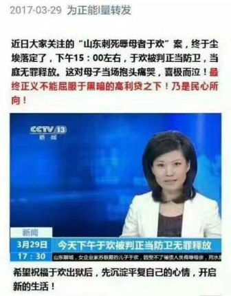 3月29日,网传轰动全国的“山东辱母杀人案”嫌疑人于欢已于3月29日被判属正当防卫,当庭无罪释放,传言配有央视新闻频道的报道截图。