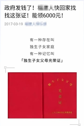 3月中旬,一条“凭借《独生子女父母光荣证》能够领到6000元”的消息在全国各地广泛扩散。文章称,独生子女的父母按企业职工基本养老保险规定办理退休的,每人都可一次性领到2000元退休补助费,父母两人加起来一共是6000元。