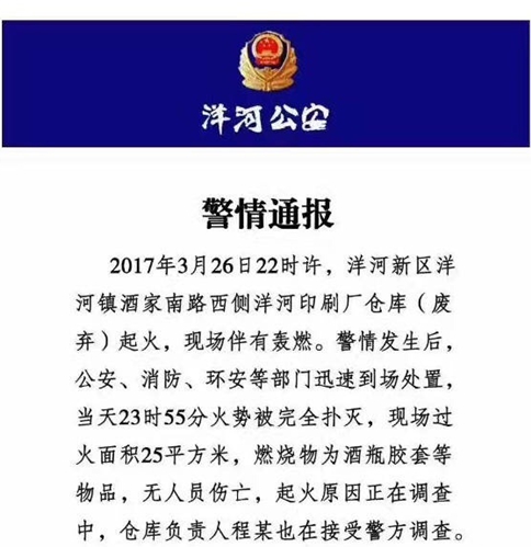 真相:3月27日上午,洋河警方发布通报称,3月26日22时许,洋河印刷厂一仓库发生火灾,现场伴有轰燃,并非液化气站爆炸,起火原因正在调查之中。