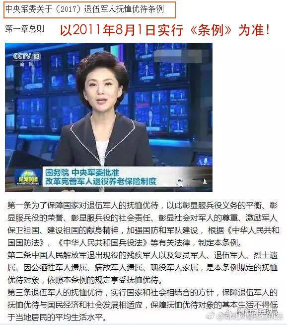 3月初,朋友圈疯传一篇名为“中央出大利好《关于退伍军人抚恤优待条例》,你家有退伍军人吗?”的网文,贴文配有一张央视《新闻联播》的画面截图,画面有“国务院—中央军委批准改革完善军人退役养老保险制度”字样。