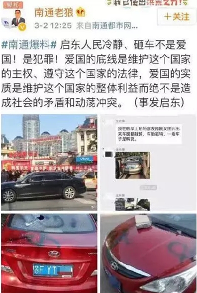 3月2日,某微博账号爆料称,在江苏启东一家乐天百货附近,有人拉横幅抵制这家超市,商场附近的韩国车被砸。爆料微博中还附有数张“车被砸”的现场图片,其中,一黑一红两辆韩系车被砸损、涂鸦,有图“有真相”,加上个别网络大V的转发,让大量网友信以为真。
