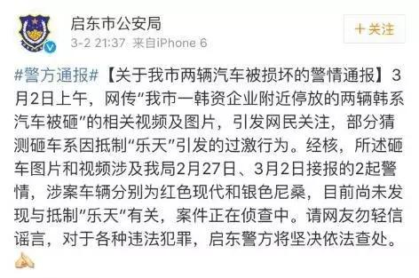 真相:随着事件的发酵,当地警方迅速介入调查。3月2日晚,南通启东市公安局发布通报称,经调查,传闻中的两起“砸车”事件尚未发现与抵制“乐天”有关,请网友勿轻信谣言,对于各种违法犯罪,警方将坚决依法查处。随后“爆料”的博主很快也心虚了,根据该博主的表述,“砸车”并非亲眼所见,也没有经过严格的核实。也就是说,并没有足够的证据能够证明这两起砸车事件与民众抵制乐天有关。