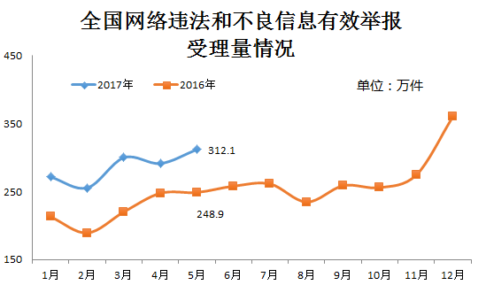 5月份,各地网信办各网站深入贯彻落实2017年全国网络举报工作会议暨第三批百家网站公布举报受理方式会议精神,同时在“六一”国际儿童节到来前,进一步加大对网上违法和不良信息,特别是淫秽色情等严重危害青少年身心健康有害信息的处置力度,受理违法和不良信息有效举报312.1万件,环比、同比分别增长约7.1%和25.4%。