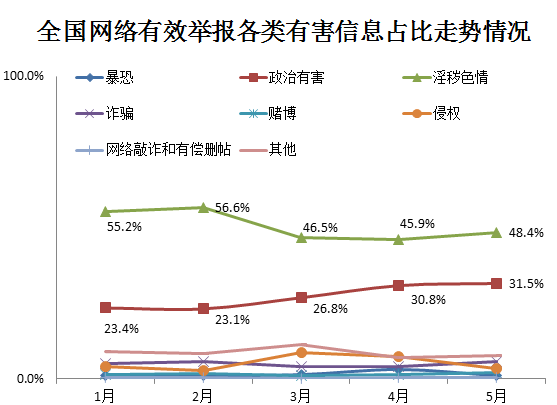 在全国网络违法和不良信息有效举报中,淫秽色情类有害信息举报较为集中,达140万件,占48.4%;政治类有害信息举报占31.5%,占比连续三个月增长。
