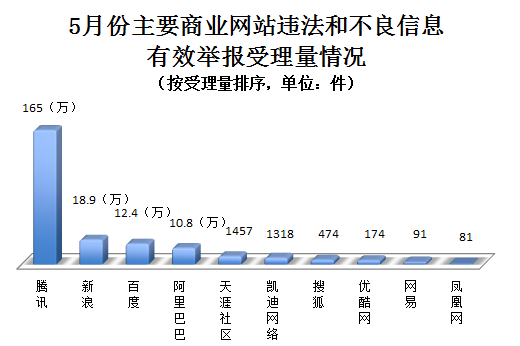 腾讯、新浪、百度、阿里巴巴等主要商业网站受理违法和不良信息有效举报207.4万件,处置或向执法部门转交199.4万件。其中,腾讯受理有效举报约165万件(微信84.6万件、QQ74.1万件、网站举报专区3.9万件、腾讯网1.7万件、腾讯微博6104件),新浪受理有效举报18.9万件(新浪微博15.7万件、新浪网3.2万件),百度受理有效举报12.4万件,阿里巴巴受理有效举报10.8万件,天涯社区受理有效举报1457件,凯迪网络受理有效举报1318件,搜狐网受理有效举报474件,优酷网受理有效举报174件,网易网受理有效举报91件,凤凰网受理有效举报81件。
