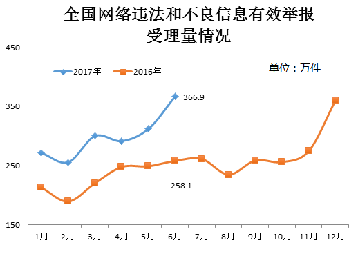 6月1日,《网络安全法》《互联网新闻信息服务管理规定》等法律法规正式实施,有效调动了广大网民对违法和不良信息举报的积极性。当月,全国网络违法和不良信息有效举报量创月度历史新高,达366.9万件,环比、同比分别增长约17.6%和42.2%。