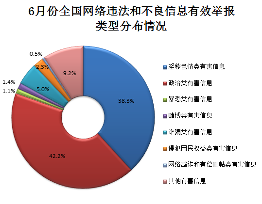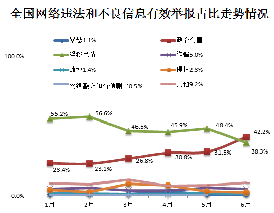 在全国网络违法和不良信息有效举报中,政治类有害信息举报占42.2%,占比连续4个月增长,并首次超过淫秽色情类有害信息举报量,达到155万件。与5月份相比,淫秽色情类有害信息举报占比下降10.1个百分点,但是数量大体持平,达140.4万件,占38.3%。