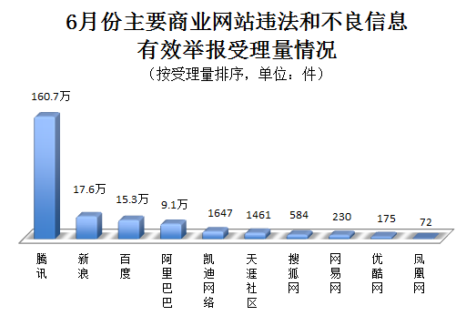 6月份,腾讯、新浪、百度、阿里巴巴等主要商业网站受理违法和不良信息有效举报203.1万件,处置或向执法部门转交195.5万件。其中,腾讯受理有效举报160.7万件(微信82.1万件、QQ 72.2万件、网站举报专区4.3万件、腾讯网1.6万件、腾讯微博5613件),新浪受理有效举报17.6万件(新浪微博15.2万件、新浪网2.4万件),百度受理有效举报15.3万件,阿里巴巴受理有效举报9.1万件,凯迪网络受理有效举报1647件,天涯社区受理有效举报1461件,搜狐网受理有效举报584件,网易网受理有效举报230件,优酷网受理有效举报175件,凤凰网受理有效举报72件。网络举报是网络空间治理体系的重要组成部分。举报中心将积极采取措施,进一步加大工作力度,及时受理和协助处置网民举报,维护公众合法权益,推动网络空间共建共治共享。欢迎广大网民向举报中心和各地各网站举报部门踊跃举报网上违法和不良信息。
