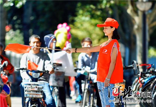一名志愿者近日在石家庄中山路育才街交口维持交通秩序。石家庄市志愿者积极参加创建文明城市活动,他们走到社区、走上街头,开展文明交通疏导、环境卫生清扫等一系列志愿服务活动。(资料片记者赵威摄)