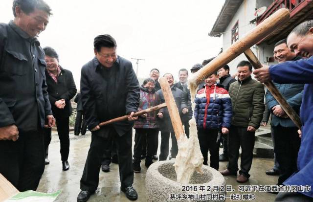 2016年2月2日,习近平在江西省井冈山市茅坪乡神山村同村民一起打糍粑