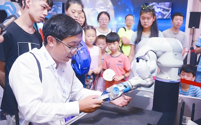 2017世界机器人大会上,参观者体验机器人技术,感受未来生活的气息。新华社发