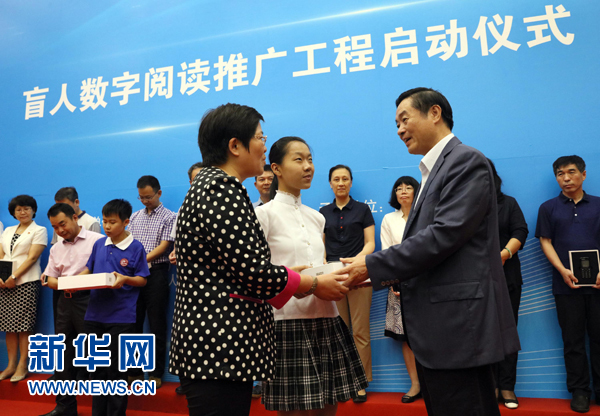 9月13日,由中宣部、财政部、文化部、国家新闻出版广电总局、中国残联组织实施的“盲人数字阅读推广工程”在北京国家图书馆启动。中共中央政治局委员、中央书记处书记、中宣部部长刘奇葆出席启动仪式,并向图书馆和盲人教育机构代表发放智能听书机、盲用电脑等盲用阅读设备。新华社记者刘卫兵摄