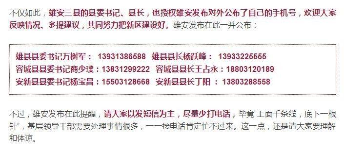 雄安新区三县县委书记、县长授权雄安发布对外公布了自己的手机号。