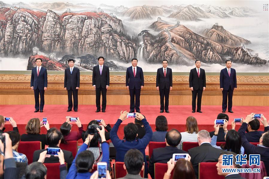 10月25日,刚刚在中共十九届一中全会上当选的中共中央总书记习近平和中央政治局常委李克强、栗战书、汪洋、王沪宁、赵乐际、韩正在北京人民大会堂同采访十九大的中外记者见面。新华社记者李涛摄