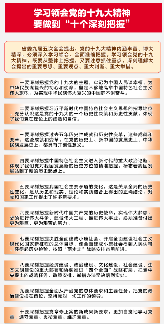 全会提出,既要从整体上把握,又要注意抓住重点,深刻理解大会提出的重要思想、重要观点、重大判断、重大举措。为此,全会明确了需要深刻把握的十方面重点,涉及党的十九大的主题、习近平新时代中国特色社会主义思想的指导地位、过去五年历史性成就和历史性变革、新时代重大政治论断等。