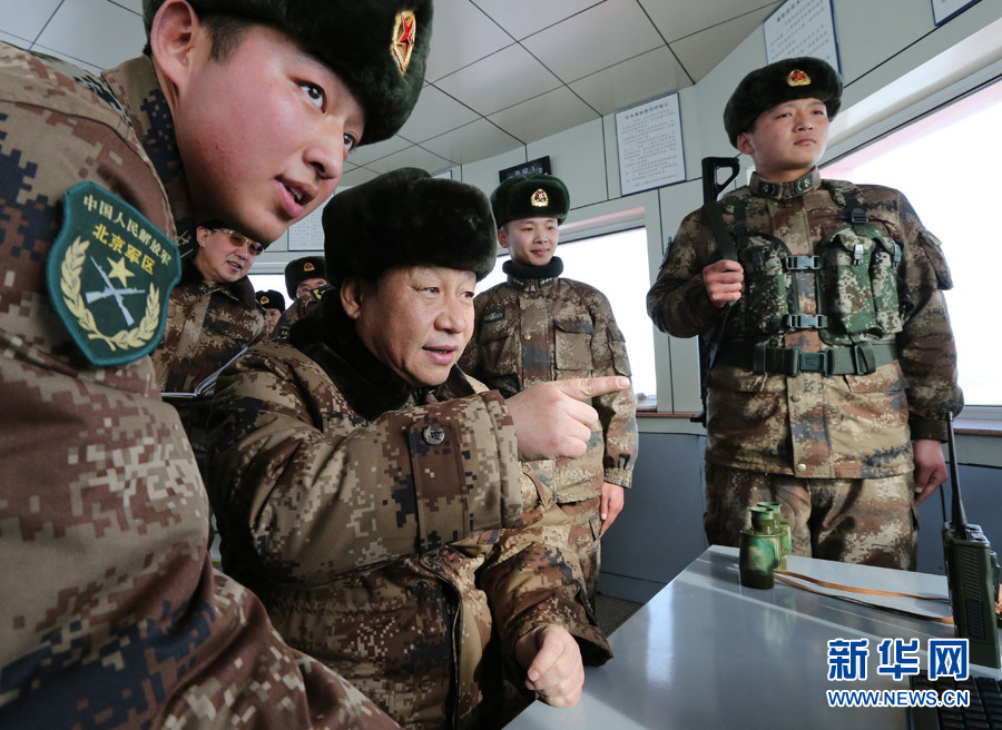 2014年1月26日,习近平专程来到内蒙古军区边防某部,亲切看望慰问戍边官兵。这是习近平仔细察看三角山哨所执勤设施,动情地对执勤哨兵说:“今天,我和你们一起执勤站岗。”新华社记者李刚摄