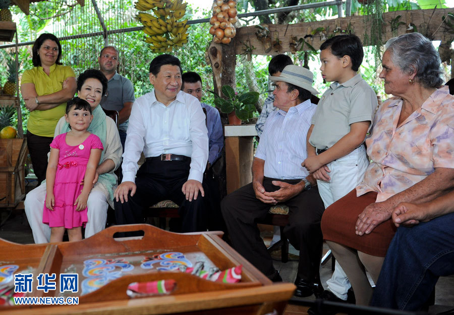 2013年6月3日,习近平和夫人彭丽媛走访哥斯达黎加埃雷迪亚省圣多明哥小镇农户萨莫拉一家,与萨莫拉一家人亲切交流。新华社记者张铎摄